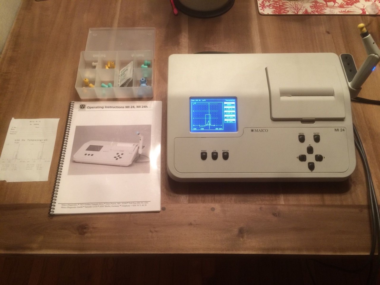 This Maico Tympanometer is barely used and comes with all the original parts and accessories. It has the user manual, all the different sizes of earbuds, and a nearly full roll of printer paper. The pictures show the machine on and a printed test I ran on myself just seconds before I took the picture. It works perfectly and is in excellent condition.
